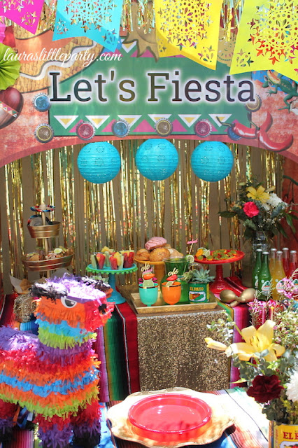 The neat part about ordering from Shindigz is that you can personalize some of their party decor with any message - I chose "let's fiesta"! I added some teal colored lace paper lanterns for an added pop of color. I hung a Del Sol banner, and gold metallic fringe in front of the arch and it all looked so festive!